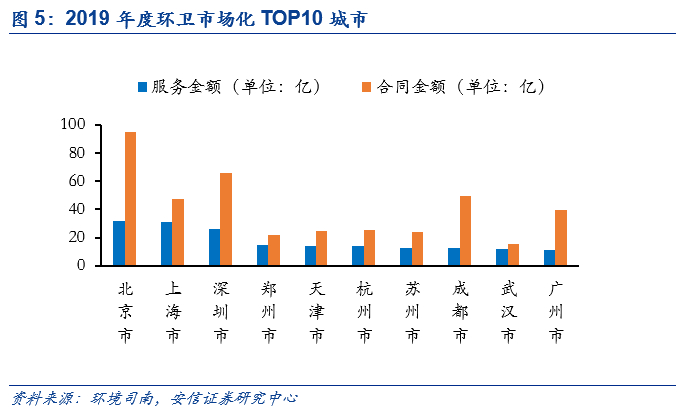 据环境司南,2019年度环卫市场化城市排行榜共有289座城市上榜,其中4个直辖市、285个地级市(含“天门市、仙桃市、潜江市”三个省辖市)。289个上榜城市中,2019年度开标环卫服务项目年化额(服务金额)超过10亿元的城市有10个,分别为北京市、上海市、深圳市、郑州市、天津市、杭州市、苏州市、成都市、武汉市和广州市。其中,北京和上海年化额超过30亿元,深圳市年化额接近26亿元。