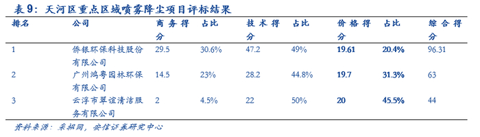 2020年4月7日,2020年天河区重点区域喷雾降尘项目发布中标公告,该项目预算金额2,360,000元,该项目中标企业为侨银环保,价格得分占比为三个企业最低,为20.4%,技术得分占比和商务得分占比都超过广州鸿粤园林环保有限公司和云浮市翠谊清洁服务有限公司,这说明环卫市场越来越成熟,当下时点不存在恶性竞争的现象。采购方更多的关注企业的综合能力而非仅仅关注价格。
