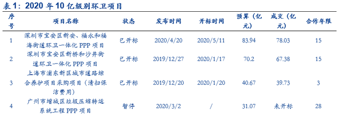 ■环卫市场化持续加速,规模品牌优势更加明显,利好龙头企业:当前,各地政府对环卫服务标准要求日益提高,而财政支付、管理能力受限,环卫服务市场化是环卫领域大势所趋。据统计,2020年至今,已有10个10亿级别环卫项目出现,其中6个为PPP模式,环卫服务市场势头良好。在目前环卫一体化趋势下,拥有资金、经验、品牌、地域优势的龙头企业将优先受益。根据环境司南,广深地区从2019年便陆续开标重磅级项目,而2020年截止目前全国10亿级以上的项目总额已达271.12亿元。环卫PPP模式推广之下,订单有望向龙头聚集,规模品牌优势更加明显。随着国内环卫一体化项目大型化趋势越发明显,政府对社会资本方的要求也是不断提升,未来优质大项目更趋向于龙头企业。