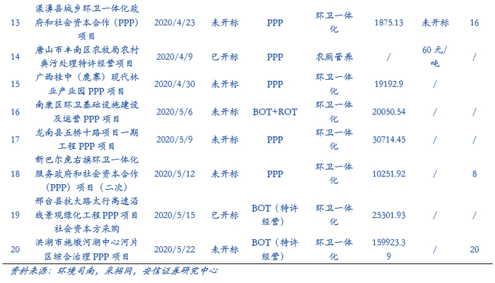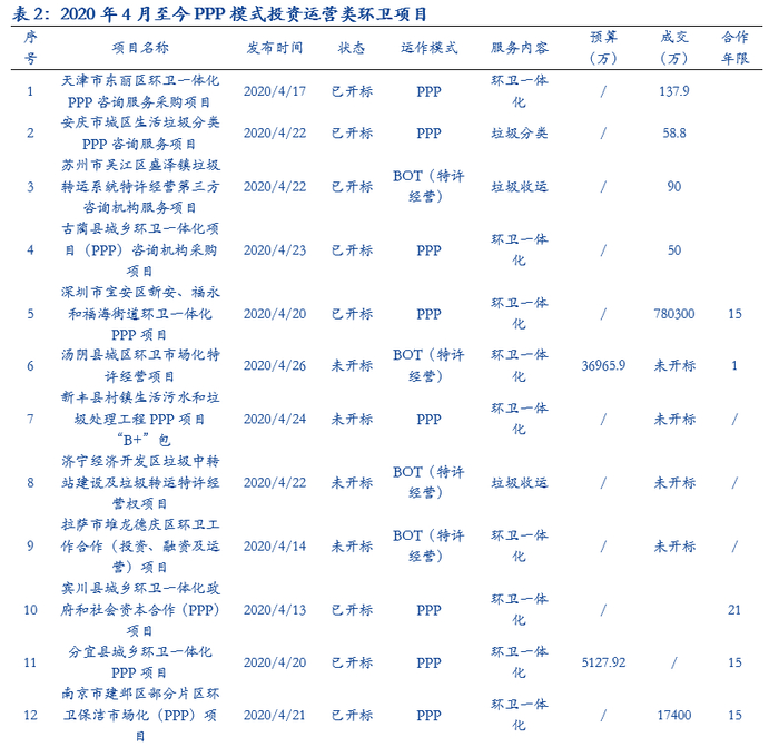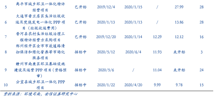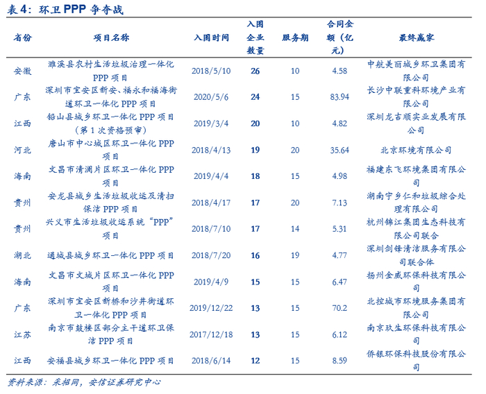 ■优质环卫PPP项目竞争激烈,大额化长期化订单抢手:目前企业间的竞争体现在资源背景、管理运营经验、服务质量、品牌、资本实力、报价等多个方面。2020年竞争愈加激烈,例如深圳市宝安区新安、福永和福海街道环卫一体化PPP项目就有24家企业入围。随着优质环卫PPP资源的日益锐减,环卫企业围绕着优质环卫PPP争夺战也必将更加激烈。大型环卫一体化项目所要求的综合能力较高,因此中小型环卫服务公司受挤压影响或更严重,集中度提升已成必然。