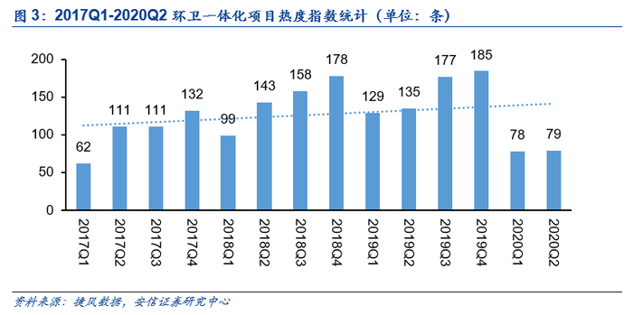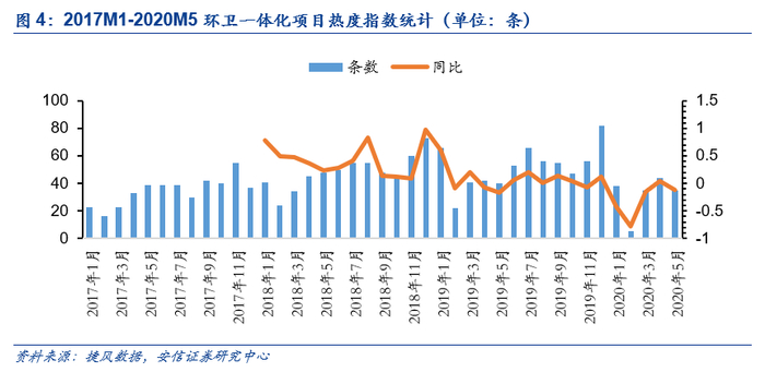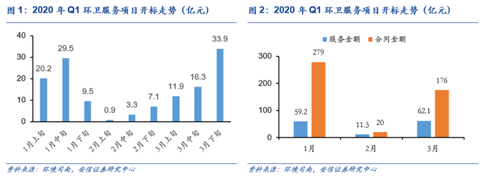 ■疫情后环卫市场化回暖,步入正轨:受“新冠”疫情影响,2月份开标环卫服务项目的服务金额骤降,根据环境司南,年化服务金额降至11.3亿,合同金额降至20亿。3月份,随着疫情在全国范围内得到控制,环卫服务政府招投标工作逐步正常化,并出现强势反弹,开标环卫服务项目金额达到62.1亿元的规模,合同金额176亿,双双创下近五年来的最高纪录。环卫一体化项目关注度逐年提高。
