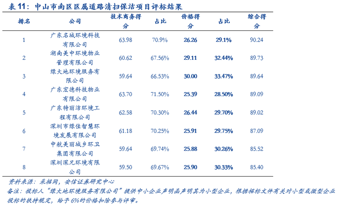 2020年5月22日中山市南区区属道路清扫保洁项目发布中标公告,该项目中标(成交)金额7584490.11元,服务期三年,中标企业为广东名城环境科技有限公司,该公司价格得分26.26,在八个企业中排名第四,占比29.1%,技术商务得分63.98,排名第一,占比70.9%,综合得分90.24排名第一。