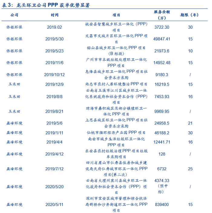 环卫PPP模式推广之下,订单有望向龙头聚集,先发优势更加明显,行业分化加剧。PPP模式的出现将使行业未来的订单体量向大型化和期限长期化转变:(1)PPP环卫项目的金额将更大,订单金额将达到亿级别甚至是十亿级别。订单包含的项目、服务地域将更大,服务难度增大,将对企业的技术和资本提出更高的要求,PPP环卫模式更加有利于具备低成本融资能力、综合治理能力和管理水平较高的龙头企业获取订单。(2)PPP模式的合同期限更长,和一般的环卫项目服务期限3-5年或者5-10年不同,大部分环卫PPP项目服务期限在10年以上,环卫服务合同的排他性更加显著,先行布局者享有较大的先发优势,通过大规模扩张环卫业务的企业,有利于扩大市场份额并获得更多的市场话语权。环卫PPP模式的两大特点,使得环卫订单进一步像龙头聚聚,加剧行业的分化。