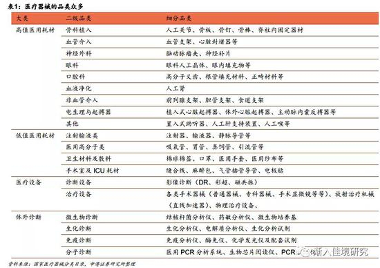 医疗器械品类众多。医疗器械可以分为高值医用耗材、低值医用耗材、医疗设备、IVD(体外诊断)四大类,根据技术原理和功能差异不同,这四大类器械又可以分成众多相互独立的子品类。
