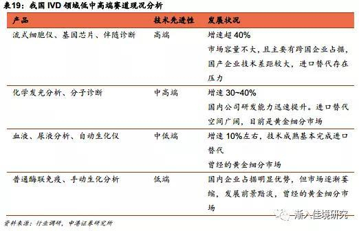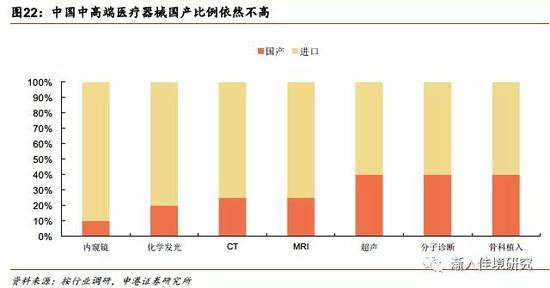 对于技术壁垒高的领域,国内企业技术跟进程度一般较低,比如关节类骨科耗材;化学发光、分子诊断、伴随诊断等IVD细分领域;MRI、内窥镜等大型影像设备。这类赛道由于技术壁垒高,在行业消费升级的大趋势下,国内配置普及率普遍仍有较大提升空间,目前多数处于行业高增长的态势。这一赛道的国内企业多通过在产业链某一环节的技术切入,基于性价比和渠道优势,在基层机构市场内进行争夺,企业中长期的价值判断逻辑则需要基于未来技术研发和跟进能力。