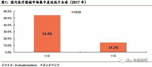 全球市场看,医疗器械呈现明显的头部集中趋势。根据EvaluateMedTech的统计,全球前20大医疗器械种类销售额达3420亿美元,合计市场规模占医疗器械总体的54.5%。反观国内,医疗器械行业的集中程度较低,前20家上市公司的市占率只有14.2%。