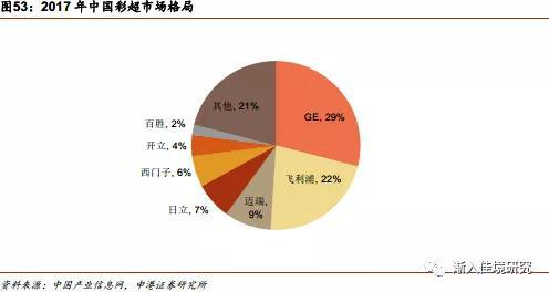 在2017年全球市场中,通用、飞利浦、东芝、日立和西门子合计市场份额达到75%,其中通用市场份额25%,位列第一,另外中国企业迈瑞市占率5%,开立市占率2%,分别位列第六、第十位。