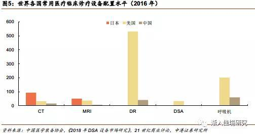 其次,中高端临床诊疗设备配置水平增长空间仍很大。2016年,我国每百万人CT保有量约为16台,而美国每百万人CT保有量约为32台,日本则约为93台,我国人均CT保有量仅约为美国的1/2和日本的1/6。我国每百万人MRI保有量约为6.4台,仅不到OECD国家平均水平的一半,不及美国与德国的1/5和日本的1/7。我国DR总保有量约为5.5万台,每百万人拥有的DR数量达41台,而美国每百万人拥有的DR数量则高达约530台。我国DSA总保有量约超过4000台,每百万人拥有的DSA数量仅有3台,而同期美国每百万人拥有的DSA数量约为33台,我国人均DSA保有量尚且不到美国的1/10。