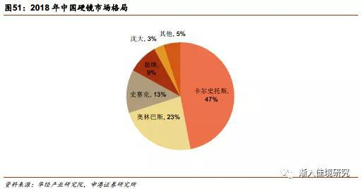 硬镜市场由于其核心光学技术高,主要被日本和德国企业占据。硬镜市场上的公司有卡尔·史托斯、奥林巴斯、史赛克、狼牌等,几家公司合计占据90%以上的市场份额。