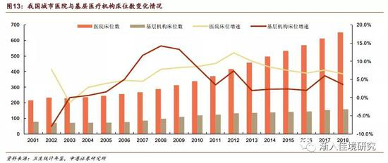 社区医疗体系建设的大规模推进,也是始于十一五规划。2006年,国务院召开了全国城市社区卫生工作会议,明确到2010年实现在全国各城市达到以街道办事处为单位,社区卫生服务中心覆盖率超过95%的目标。随后的几年间,我国基层卫生服务机构规模持续增长,床位数量增速远远超出同期医院机构。