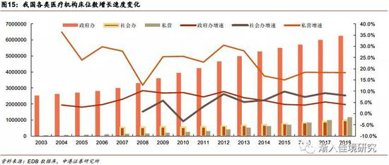 按照十二五规划要求,到2015年,非公立医疗机构床位数和服务量均达到医疗机构总数的20%左右。自此以后,社会办医成为我国卫生资源配置扩容的主力军,同期政府办医疗机构床位数的增长回归到5%左右的自然增速。
