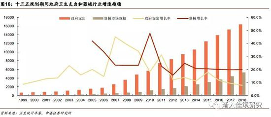 受益于此,2016年国家发布的十三五卫生规划中,大规模的增量政府卫生投入不再唱主角,优化资源配置水平和使用机制成为新的主题。体系上,强化基层医疗卫生服务能力建设,构建分级诊疗机制,提升存量卫生资源利用效率成为新的要求。随后的几年中,国家政府卫生支出的增速保持基本稳定,与此相适应的,是我国医疗器械行业增速始终稳定在20%左右。