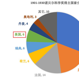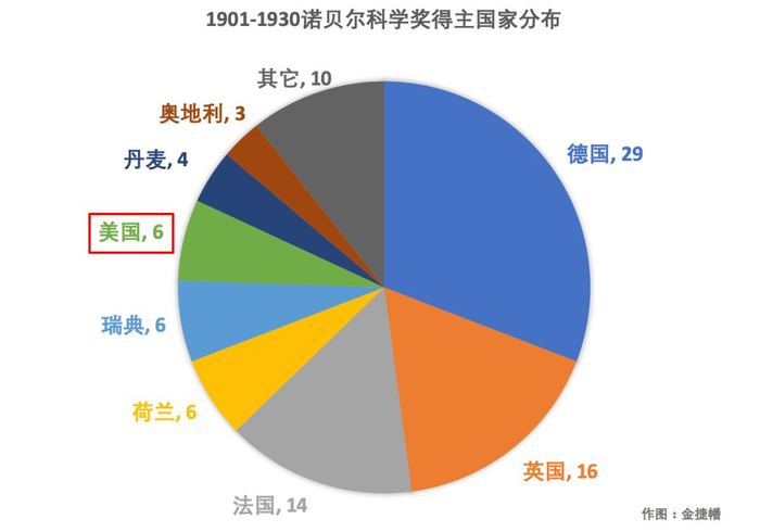 这张图排除了文学和和平两项奖。我们可以看出,美国在二十世纪初的科研水平远远落后于欧洲,甚至单比德英法任何一个都比不过。我特地查了一下,美国这6个获奖者当中,其实有3个人还是出生欧洲的移民。
