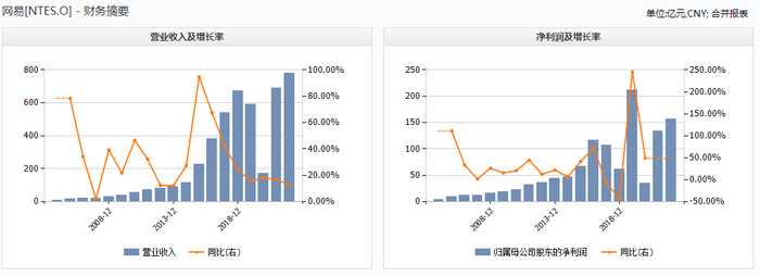 在美国上市以来,网易的营收与净利润维持着极高的增长率。以2004年至2019年的营收为例,2004年时,网易的营业总收入为9.04亿元人民币,净利润4.41亿人民币,到了2019年营业总收入翻了65.7倍变成了592.41亿,净利润则翻了48.07倍变为212亿。