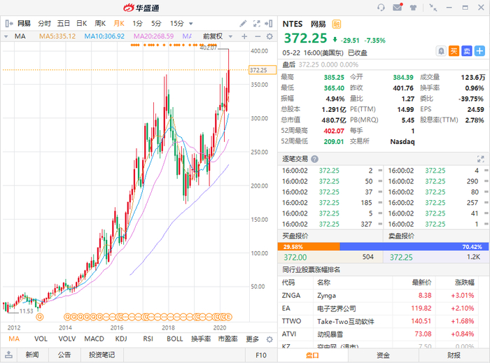 在中国只有两家,一家是茅台,另一家是网易。”事实上,从 2000 年 6 月在美国纳斯达克股票市场上市开始,网易股价一直处于上涨通道,在最近三年多的时间里,更是走出了一条几乎完美的上扬曲线,股价攀升到 400 美元以上,市值接近 500 亿美元,在 17 年来,股价暴涨了 2000余倍,成为了当之无愧的“中概股第一牛股”。