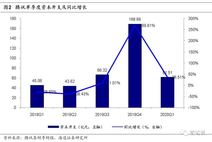 阿里腾讯资本开支逐季加速。腾讯5月13日发布2020年一季报,阿里巴巴5月22日发布2020财年(2019Q2-2020Q1)业绩快报,我们可以从两个公司的财报中对云计算产业做分析。阿里巴巴20Q1资本开支96.83亿元,同比增长48.13%,2019Q2-2019Q4单季度资本开支分别为63.82、98.26、66.59亿元,同比增速分别为-43.04%、-20.72%、24.56%,阿里单季度资本开支同比增速由负转正。腾讯20Q1资本开支61.51亿元,同比增长36.51%,2019Q2-2019Q4单季度资本开支分别为43.62、66.32、168.69亿元,同比增速分别为-38.43%、11.01%、269.61%,与阿里相同,腾讯过去一年单季度资本开支增速也出现由负转正。阿里腾讯资本开支的逐季增速加快,显示了云计算产业的景气反转。