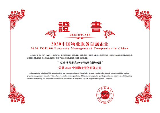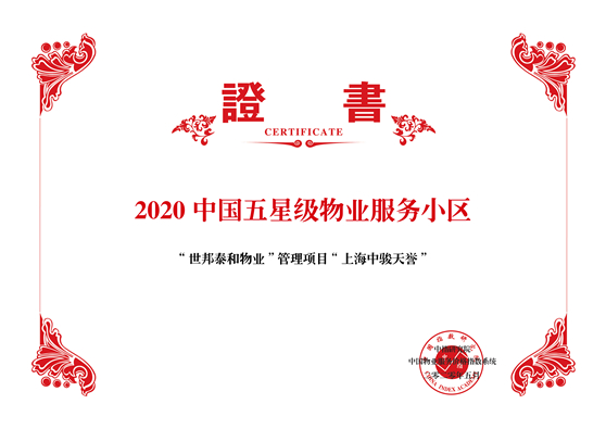 大会表彰了物业服务优秀企业,世邦泰和物业荣获“2020中国物业服务百强企业”,其管理的“上海中骏天誉”项目荣获“2020中国五星级物业服务小区”。