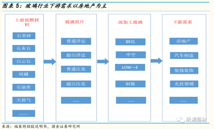 玻璃行业作为制造业,处于整个产业链的中游。上游产业主要包含三大类,分别是:石英砂、石灰石等矿产资源,纯碱,天然气、石油焦等燃料。下游需求分布在房地产(门窗、幕墙、隔断、镜片等装饰)、汽车制造以及其他领域,其中:房地产领域需求占比最高,达到75%。由此可见,玻璃行业发展与下游房地产行业的关联性较高,同时硅砂、纯碱、燃料等原燃材料价格的变动也对企业利润产生较大影响。