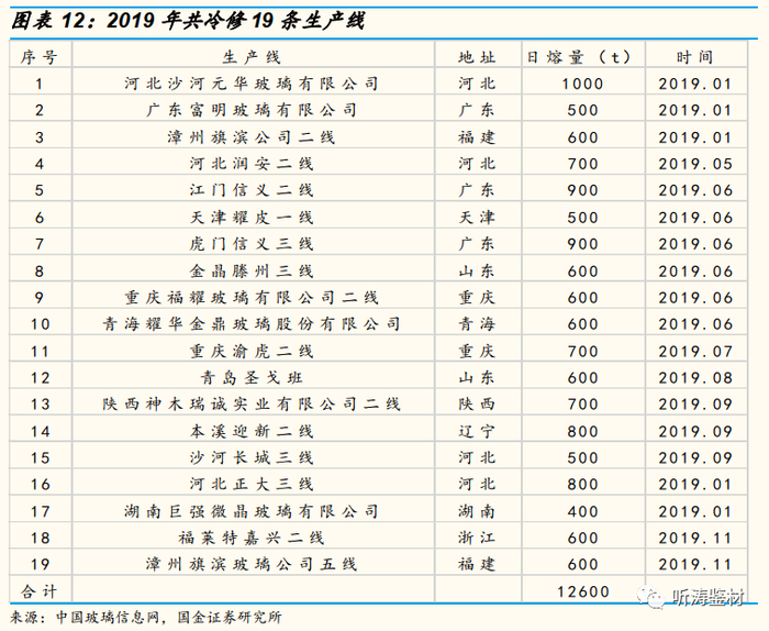(2) 2019年上半年,玻璃市场并未好转,6月份再次出现集中冷修的高峰,共冷修6条产线,全年共冷修19条产线,合计产能12600t/d。