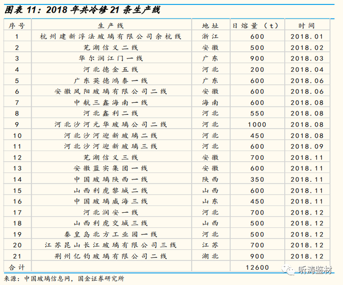 在2009-2011年行业上行周期中,有较多生产线投产,理论2017-2021年行业将处于冷修高峰期。经我们梳理,2018年至今,玻璃已出现三次冷修小高潮: