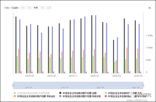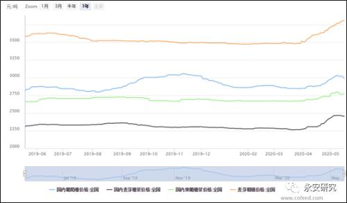 据cofeed统计,截止2020年5月15日,全国25家葡糖糖企业开工率为55.82%,28家果葡萄糖浆企业开工率60.16%,22家麦芽糊精企业开工率63.71%,36家麦芽糖浆企业开工率65%,整体行业开工率处于历史偏低水平。开机率偏低原因一是疫情发生,使得下游消费骤减。二是,运输原因使得原料、产成品运输受阻。三是疫情使得用工困难,企业被迫停产。四是,资金困难,负债偏大等其他原因所致。企业开机率偏低,使得对原料玉米淀粉的需求被抽减,价格低迷。