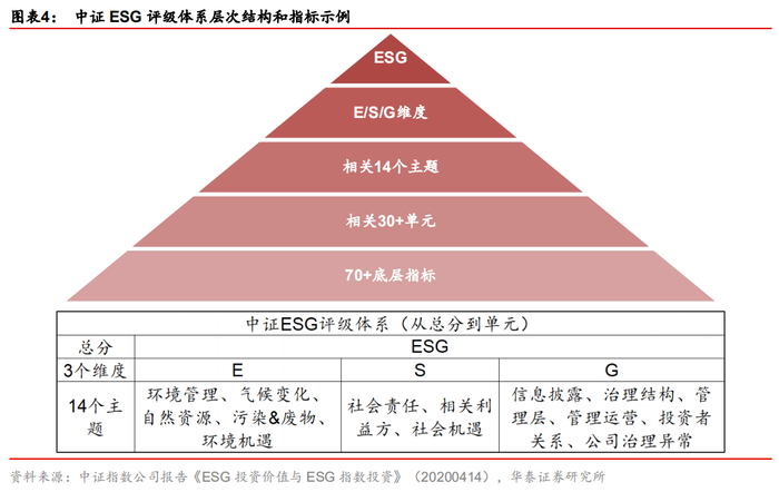 中证ESG评级指标体系从上而下分为五个层级,分别为ESG整体评价、E/S/G三个维度评价、14个主题、30余个单元、70余个底层指标,兼顾合理性、数据质量、区分度等多个因素,还对各个行业进行差异化设计,以反映每个行业内最重要的ESG问题(详见下面图表)。