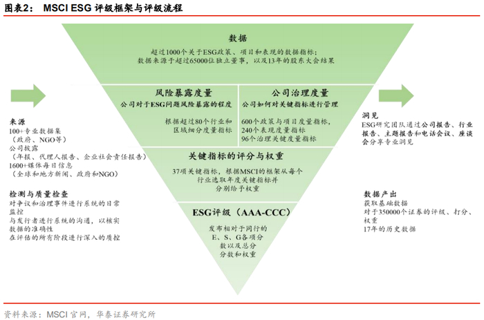 在这一评级框架下,MSCI的团队主要对37项关键指标进行评分,重点关注公司核心业务与可能为公司带来重大风险和机遇的行业问题之间的交集。根据相对于同行的标准和业绩,MSCI将为企业给出从AAA到CCC的评分结果。更多详细信息参见华泰证券策略团队研究报告《海外ESG投资全景手册ESG投资研究系列之一》(20191010)。