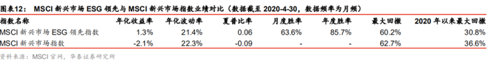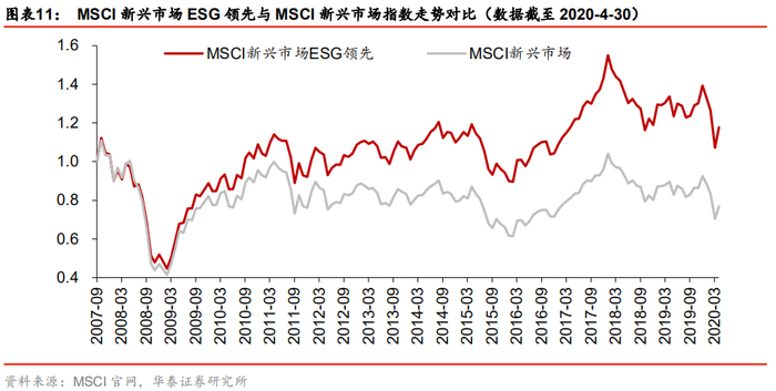 ESG投资在欧美市场发展相对成熟,在新兴市场起步未远、ESG选股策略具有较为明显的超额收益。MSCI新兴市场ESG领先指数的基日是2007-9-28,我们将其与MSCI新兴市场指数点位归一化(以2007-9-28点位为1进行归一化),作图比较如下。可以看出,在2007-9-28至2020-4-30区间内,MSCI新兴市场ESG领先指数收益明显高于MSCI新兴市场指数,二者的业绩对比详见图表12。相较之下,MSCI新兴市场ESG领先指数有更高的年化收益率、更低的年化波动率、更小的回撤,业绩表现全面优于MSCI新兴市场指数。MSCI新兴市场ESG领先指数相对MSCI新兴市场指数的月度胜率为63.6%、年度胜率为85.7%,说明前者相对后者的超额收益还是比较稳定的。