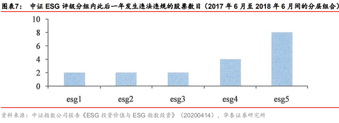 中证ESG评级体系重视负面事件的管理,通过若干量化指标来度量上市公司的负面影响,例如环境维度下面的污染&废物指标、公司治理维度下面的公司治理异常指标等。实际上,对于2017年6月至2018年6月间的ESG各个分层组合,若统计组内此后一年发生被证监会立案调查、行政处罚或交易所公开谴责、公开认定等风险事件的股票数目,可以发现ESG评分较低的股票发生风险事件的概率更高(详见下面图表)。
