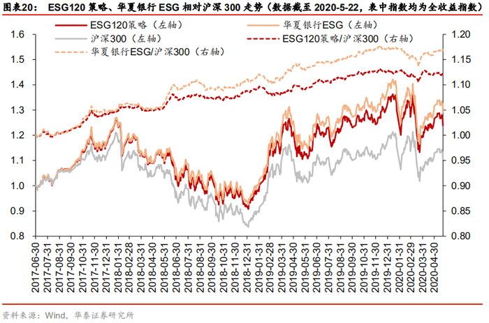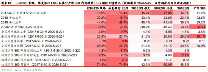 在图表19中,我们将ESG120策略、华夏银行ESG指数和其它沪深300内选样的ESG指数进行业绩对比。可以看出,在全区间(2017-6-30至2020-5-22)内,ESG120策略、华夏银行ESG的年化收益率、夏普比率、最大回撤方面均表现优异,超过图表19中其它ESG指数;分不同年份来看,ESG120策略、华夏银行ESG的表现也相对比较稳定;相对沪深300来看,ESG120策略、华夏银行ESG的年化超额收益率均在4%以上,年化跟踪误差均在3%以下,信息比率分别为1.82、2.22,表现优秀。