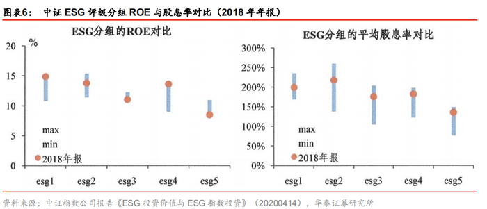 我们将图表5中的五个分层组合的平均ROE和股息率展示在下面图表中,可以发现,ESG评分高的组确实具有比较高的ROE和股息率,且随着ESG评分降低,ROE和股息率整体呈现下降趋势;图表5数据已经说明了ESG评分高的组倾向于具有更高的收益,结合来看,中证ESG评级体系在沪深300成分股内盈利传导机制基本符合我们的预期。