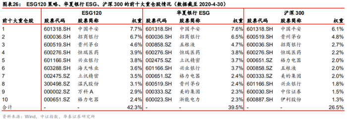 ESG120策略、华夏银行ESG指数的市值分布情况类似沪深300指数,但1000亿元以上公司占比更高,也就是说这两个指数更加偏好大市值股票(详见图表25)。观察ESG120策略、华夏银行ESG、沪深300的前十大重仓股(详见图表26),发现股票重合度还是比较高的,它们的前十大重仓股合计占比分别为42.3%、39.5%、26.5%。由于这些股票多为行业内大龙头股票,且通过了ESG评分筛选,相当于保障升级,因此ESG120策略、华夏银行ESG指数可谓“荟聚沪深300中硬核资产”,对于偏好龙头企业的投资者是比较适宜的投资工具。