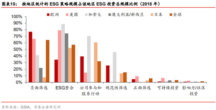 全球不同地区应用ESG的形式具有较为明显的差异。我们计算每个地区内,各个ESG策略规模占该地区ESG投资总规模的比例(由于资产管理人可以同时采纳多种ESG策略,所以每个地区内各策略占比之和不等于1)。从下图中可以发现,欧洲更偏好负面筛选,美国、加拿大、澳大利亚/新西兰更偏好ESG整合,日本更偏好公司参与和股东行动。