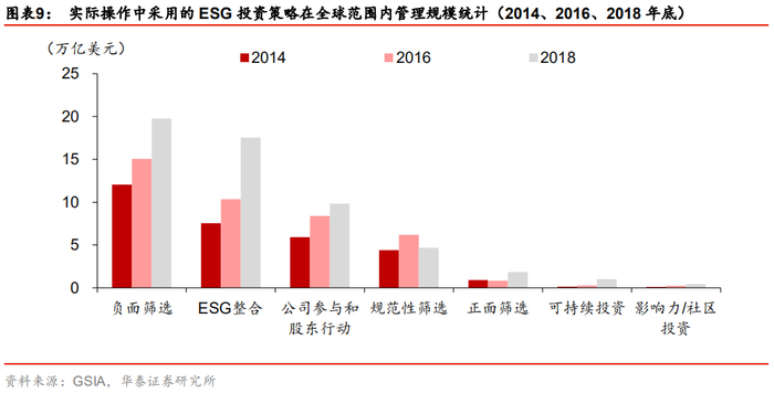 截至2018年底,负面筛选和ESG整合策略使用最为广泛。其中负面筛选策略主要通过剔除高风险公司来降低组合整体风险,2018年该策略管理规模大约为19.8万亿美元,与2016年相比增长31%,是当前使用最广泛的策略。规模仅次于负面筛选策略的是ESG整合策略,该策略的主旨在于将环境、社会与治理三个要素融入传统的投资决策中,2018年其管理规模大约为17.5万亿美元,相较2016年增长69%,增速高于负面筛选策略。