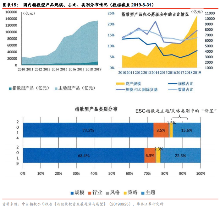 国内指数型产品在2018-2019两年发展较快,不论是从管理规模大小、还是在公募基金中占比情况来看,都呈现比较明显的上升趋势(详见下面图表,引用自2019-9-25中证指数公司报告《指数化投资发展趋势与展望》)。ESG指数在中证指数官网被归类成主题或策略类别指数,具体取决于指数构建过程中是否采用了量化选股策略。根据下图,国内市场的主流还是传统的规模类指数,占比在七成左右;主题或策略类指数均有一定发展空间,ESG指数作为主题类指数中冉冉升起的新星,其未来更加值得期待。