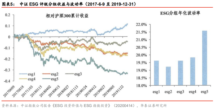 通过因子测试中常见的分层测试法,可以检验中证ESG评级体系的有效性和区分度。首先将沪深300成分股按ESG评分由高到低分成5组,然后计算各组相对于沪深300指数的累计收益及波动率数据。下面图表中,esg1为评分最高组,esg5为评分最低组,从2017-6-9至2019-12-31,esg1相对其它组一直具有较为明显的优势,且相对沪深300累计收益为正。从年化波动率角度来看,ESG评分高的组倾向于有比较低的波动率(但并非绝对单调的)。总体来说,中证ESG评级体系是具有良好的收益和风险区分度的。