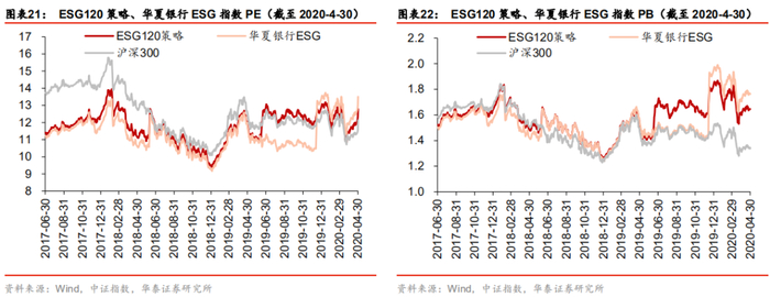 在A股市场参与ESG投资的选择之一是借助指数工具。以ESG120策略和华夏银行ESG指数为例,它们在沪深300成分股中借助ESG评分进行负面筛选,再依据估值、股息、质量与市场因子综合选股,同时通过控制行业中性来降低风险。从历史业绩来看,它们在2017-6-30至2020-5-22区间内相对沪深300跟踪误差小、信息比率在1.8以上;从基本面来看,它们兼具高盈利、高成长属性,市盈率不高;从持仓来看,龙头企业占比更高,且通过ESG评分筛选,相当于保障升级。总之,ESG120策略和华夏银行ESG指数对于以沪深300为业绩基准的投资者具有较高投资价值。