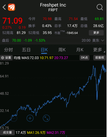 天风证券在研报中更是表示,宠物食品行业是可以诞生大公司的赛道。美股市场中,蓝爵食品(BUFF)被80亿美元收购,而鲜宠公司(FRPT)过去三年涨幅近10倍。尽管BUFF和FRPT处于不同的成长阶段,但是共同点是资本市场都给予了高估值。从PS(市销率=总市值÷销售额)估值来看,BUFF估值区间4-6倍,FRPT估值区间4-10倍。