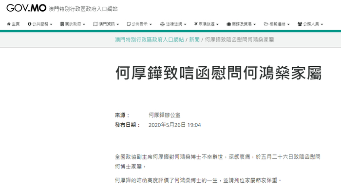 全国政协副主席何厚铧对何鸿燊博士不幸辞世,深感哀痛,于五月二十六日致唁函慰问何博士家属。
