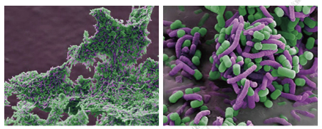 为了验证这种菌株能赶跑幽门螺旋杆菌,研发人员专门做了个实验:用美国 FEI Quanta 200 ESEM FEG 扫描电镜,发现了「赶跑」的全过程。
