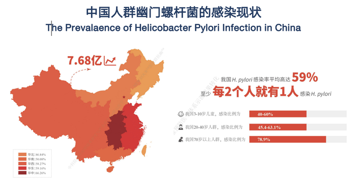 可我国幽门螺旋杆菌平均感染率太高了,高达 59%,其中至少每 2 个人中就有 1 个人感染。
