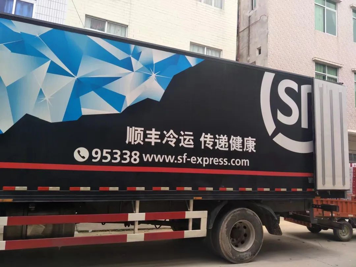 不到8点,采摘的荔枝便被运输到恒温分拣中心,进行剪枝、筛选、打包(泡沫箱+保鲜袋+冰袋+纸箱),再迅速放入顺丰冷链车内,整个过程不过5个小时!
