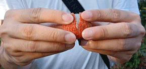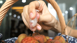拿一颗,沿着中间的缝线指头轻轻一捏,半透明凝脂状的果肉便露了出来。