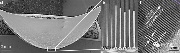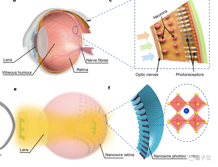 △图d为人工视网膜主体,e为镶嵌其中的纳米材料感光点,f为甲脒碘化铅杂化钙钛矿单晶结构。