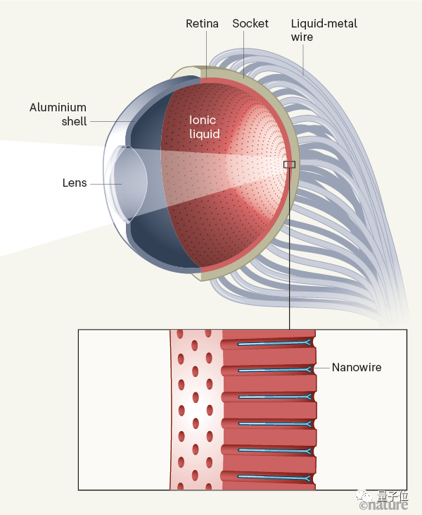 EC-EYE与人类的眼球结构毫无二致,由透镜(晶状体)、离子液(玻璃体)、感光阵列(视网膜)、导线(视神经)组成。