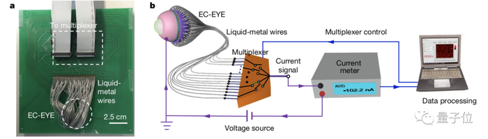 液态金属线通过电路板连接到由计算机控制的100×1复用器。