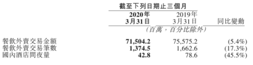 2020年一季度财报指出,新冠疫情对美团餐饮、酒店及其他本地生活服务商家的日常运营造成严重影响。报告期内,餐饮外卖业务的交易金额同比减少5.4%至715亿元。