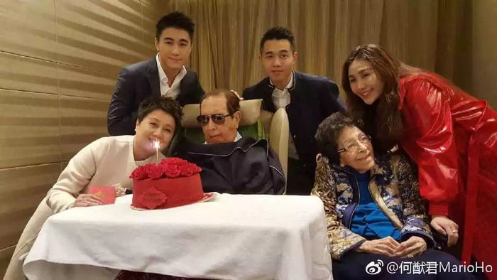▲ 2018年11月25日,97岁生日,何鸿燊在医院度过。图为四房一家为他庆生。图片来源:何猷君微博
