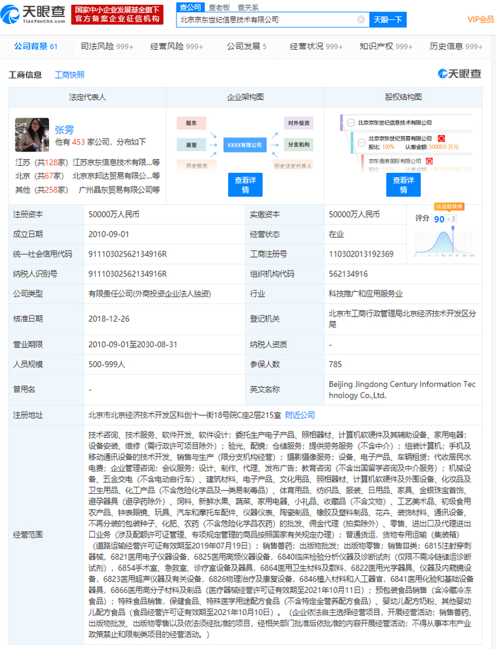 北京京东世纪信息技术有限公司成立于2010年9月,注册资本5亿人民币,法定代表人为张雱,公司经营范围包括计算机软硬件及外围设备、体育用品、纺织品、服装、日用品的批发、佣金代理(拍卖除外)、零售、进出口及代理进出口业务;普通货运,货物专用运输(集装箱);出版物批发;出版物零售等,该公司由北京京东世纪贸易有限公司全资控股。