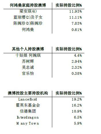 2012年何氏家族争产事件后,何鸿燊原配子女获得浅水湾道一号大宅及30亿港元现金,但并无股份安排,二房太太蓝琼缨子女一方面继续加强对信德集团(0242.HK)以及新濠国际、新濠博亚娱乐(MLCO.US)的控股之外,对于澳博持股也从IPO时的1.1%增至2012年底的11.11%,三房太太陈婉珍获得博彩股澳门励骏(1680.HK)股份之外,对于澳博持股也从IPO时的0.14%增至2012年底的7.83%,四房太太梁安琪则连同新分配的澳娱,合计持有11.93%的澳博股份。